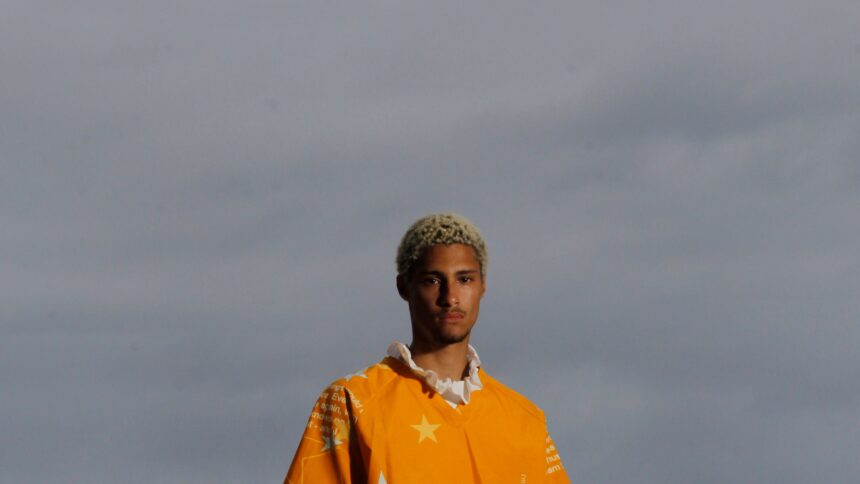 Leaning into ambiguity, he applied the expression in a cyan blue sans serif to a gray v-neck knit that was layered over a red ruffled collar and paired with printed board shorts, surfer-style. It also appeared on a t-shirt in clip-art font, over a fluted silk chiffon skirt cut on the bias with a hat fit for a romantic drifter. Rash-shirts and tanks were a through line to his early days of working in gradient stretch fabric, but in bold athletic primaries. A business shirt and tie were paired with oversized cotton shorts. Levy’s book contains ideas about existing in the internet age and identities, real and projected. Higgins said he wanted to take tropes and collapse them all into one, so these disparate elements, and dress codes, were clashed and mixed.