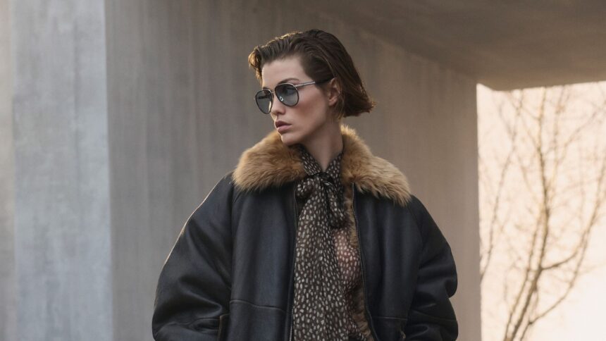 The studio team and the artisans clearly considered “going the extra mile” a pastime for amateurs, so they carried on well past it. They indulged their creative instincts in a full-on parade of inventive textures and surfaces: yarns were persuaded into intricate wool lace interlaced with sequins; wool was twisted into elastic fusilli-like fringes cascading down a bomber in a vaguely dreadlock-ish mood; and knitted mohair was teased into buoyant fluffy fringes, its sequined filaments enveloping a sweeping long cape coat. Even the piece that read, at first glance, as a plush mink-soft bomber turned out to be pure wool knit, engineered to illusionistic levels of pillowy fur-like fullness.