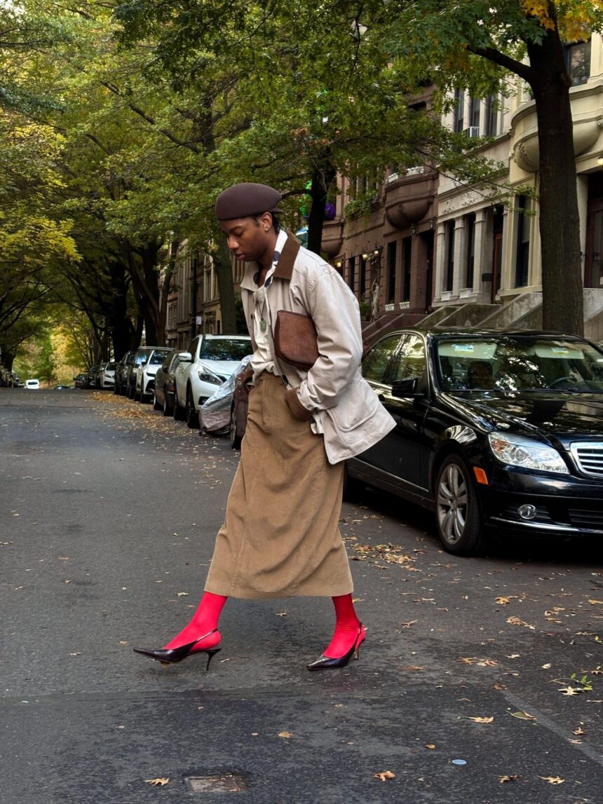 Johnson is known for his forward-thinking styling—always ready to experiment and make the familiar feel new and unexpected. His favorite winter accessory to elevate a look? Tights—for day and night. “I tend to gravitate to a punchy red tight which feels right for the holidays but works just as well long after. I love a shimmer tight that catches the light when you walk, and you really can’t go wrong with an essential black sheer. I go back and forth between a 50 denier and a 20 denier,” he says.