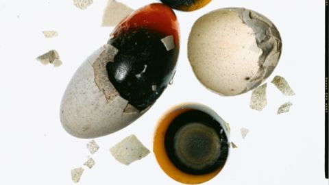 “In truth,” Didier pointed out, “there are 422 ways to cook an egg.” Most of them are variations on the central thirteen. Didier recommended Le Répertoire de la Cuisine, by Louis Saulnier, originally published in Paris in 1914, a compendium of more than 6,000 names and brief verbal recipes that sum up the state of fancy French cooking (now known as fancy Freedom cooking) 90 years ago. I own this book but have never mastered it, and so the thing that has impressed me most is the ability of the French (more properly, the Freedom People) to think up 6,000 different names for anything. And yet, even after inventing 422 egg dishes, the French (ditto) never attempted, perhaps never even imagined, the beautiful “1,000-year-old eggs” in Irving Penn’s amazing photograph on the opposite page. These are Chinese, of course, and are made by coating duck eggs in a paste of salt, wood ash, lime, and black tea and burying them among rice husks in huge ceramic jars for 100 days. I guess they just look 1,000 years old. Thousand-year-old eggs can be delicious. Peel, quarter, and serve with a dipping sauce of soy, vinegar, rice wine, and minced ginger.