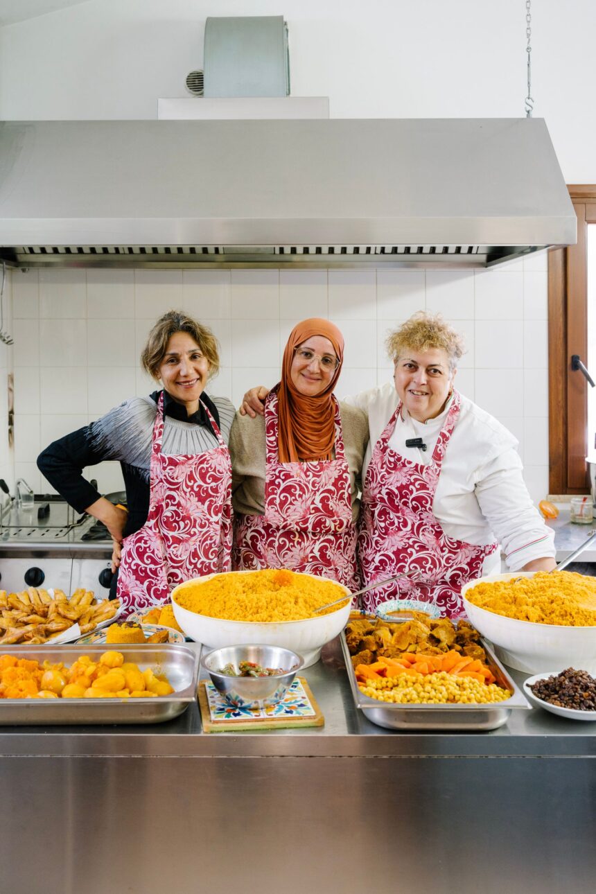 Several pairs of hands help scrape steaming couscous into a large bowl while others peel potatoes, carrots, and onions. More than 10 women are crammed into the small kitchen, chatting loudly and laughing with one another. “It’s like a wedding in Tunisia! There, all the women always make couscous together,“ says Salha Zaouali, one of the women working at Al Ciliegio, a restaurant located in a property confiscated from the mafia, in the small Sicilian town of Salemi, about an hour’s drive from Palermo. Here, migrant women from North Africa cook alongside women from Sicily, sharing recipes and learning Italian along the way—and in doing so, having the chance to fully integrate into the local community.