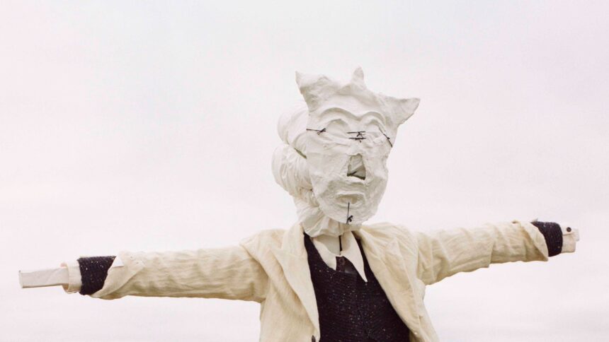 That feeling of having stepped through a portal to a past world was enhanced by the dilapidated interior, complete with peeling plasterwork and cobwebs, and hot cider being served from a tureen, underneath a ceiling patched up with corrugated iron where the chapel was bombed during World War II. Antique chairs had been arranged in concentric circles around a central rostrum, where a spotlight was fixed on one of a dozen or so mannequins that had been placed at the outer ring. Well, not mannequins exactly, as, after peering through the gloom, they turned out to be scarecrows (or crucified figures?) their heads crafted from papier-mache like effigies or totems left over from some ancient pagan ritual, some with little peaked black caps sat atop their heads. “I’ve always been fascinated by scarecrows,” Skelton said after the show, citing his obsession with a ’90s photography book by Colin Garratt. “Some of them are really beautiful and elegant with great coats, and some have this sinister feel. There’s a weird duality where they can feel kitsch and then also quite evil, as if they could spring to life all of a sudden.”