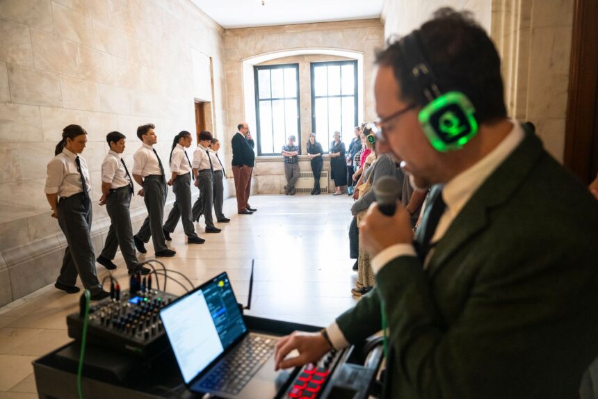 Here’s how it works: About 15 of us trail the lithe, smiling, silent Barnes—playing a library page, delivering materials to researchers around the library—wearing wireless headphones that let us hear the narrator and the music. (Think a silent disco, but others do all the dancing.) The narrator, a dapper Saenz de Viteri, tells the story and gives directions between pushing a rolling cart bearing a small console of knobs and buttons. We’re all dodging actual library visitors, including many tourists (who seem understandably more confused than anyone). Signs in each room duly alert patrons to the possibility of a distraction during specific performance times, and staffers make sure foot traffic doesn’t impede the show—but once people see the dancing, they quickly clear aside and begin watching themselves.