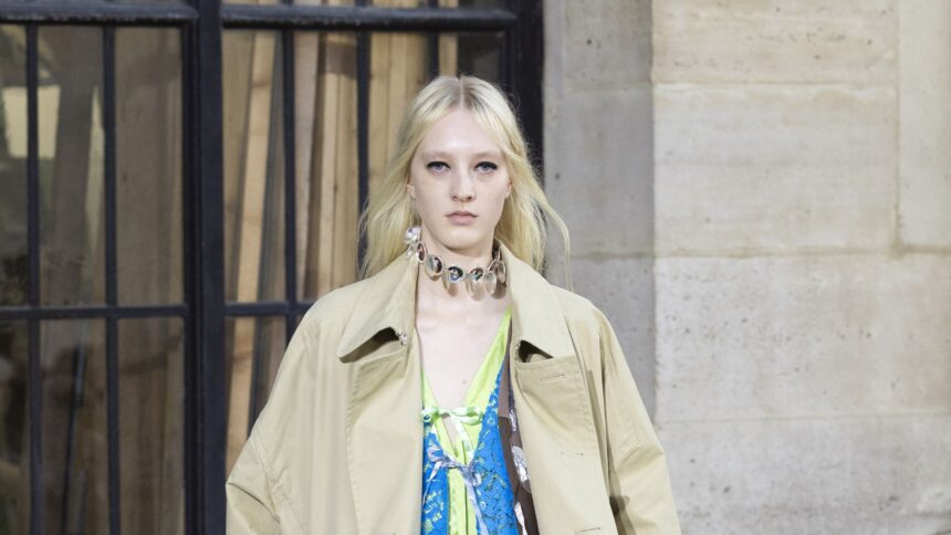 That impulse touched the whole lot. It upended the same old day to nighttime order of a runway present in favor of a no matter, all of it works strategy. Rogge opened with an acid lime boudoir slip and kingfisher lace peignoir layered beneath a slouchy beige trench, blithely mixing up the practicality of day with the glamour of night, earlier than emblazoning Mueller’s most well-known line about not being wild, however wild discovering her (I’m paraphrasing right here) over a vividly hued satin gown with a photograph print of a searing blue sky on one facet, and on the reverse fucked up, bow-trimmed leather-based, or later, presenting a marriage gown, historically the closing look in an old-fashioned Paris runway present, about two thirds of the best way by means of the lineup. “Simply since you’re married it doesn’t imply life stops,” Rogge stated was the purpose of that working order. I eyed the present’s remaining appears to be like, all brief swingy attire—one of many main tales of the season—a few of them worn with the elegant punketerie of the graphic silver chokers and bauble necklaces by Belgian jewelers Wouters & Hendrix in collaboration with Rogge. “It actually appears to be like like she’s nonetheless having enjoyable,” I stated to Rogge. “Perhaps she selected polyamory after she bought wed.”