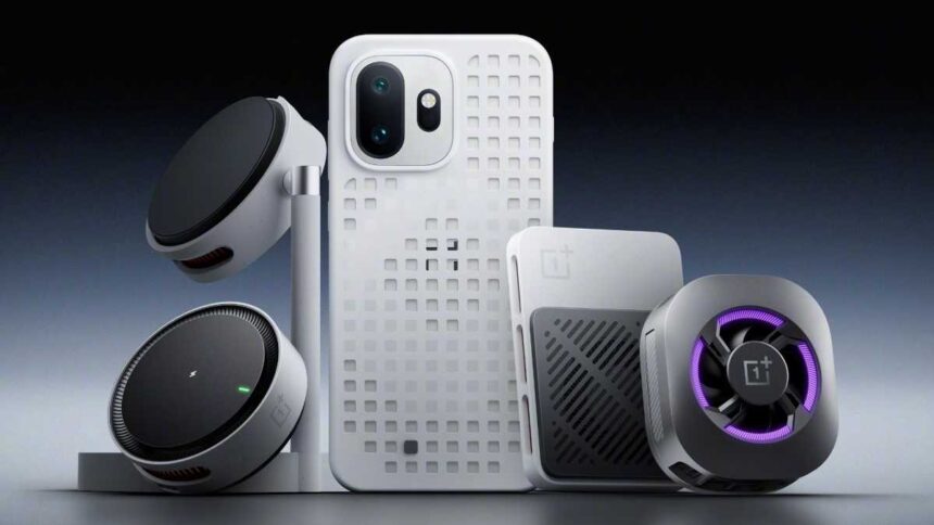 But the really interesting bit is the attached image, which shows the OnePlus 15T surrounded by four accessories – five if you count the mesh-like case that’s fitted onto the phone itself.