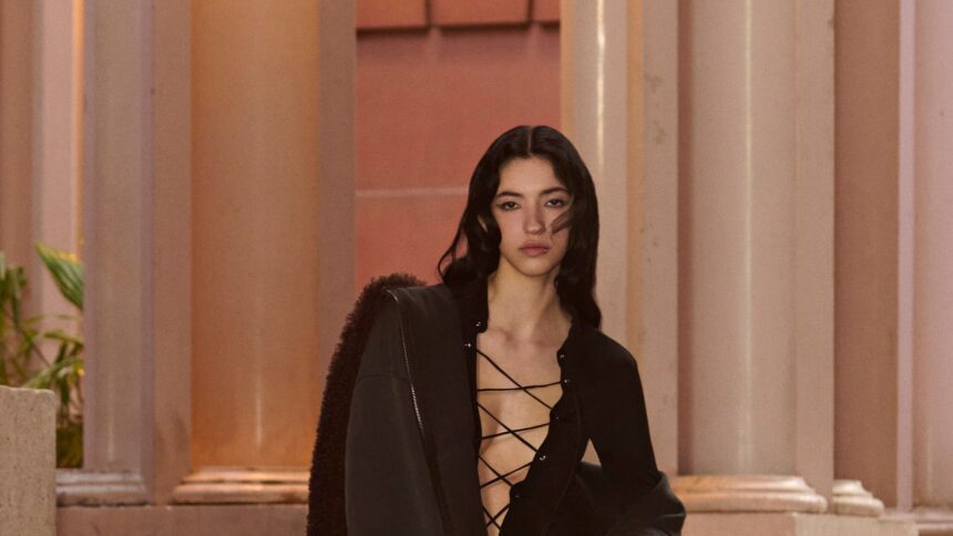 Sexy, going-out attire is definitely what Priscavera does best, so the new offering sees Franchetti translating ’90s elements into pieces that are ready to party. “I wanted to infuse a fun element back into fall,” she noted. “We had a little more adventure in the color palette—more layering and transparency.” The opening look, for one, was a laced-up low-cut top paired with a bleached pair of trousers—the 2026 version of what one wears to hit the clubs. She also designed a totally-sheer plaid slip dress, paired over pieces like a stud-trimmed black bra top and briefs, or a more demure lacy black square-neck dress with matching tights.