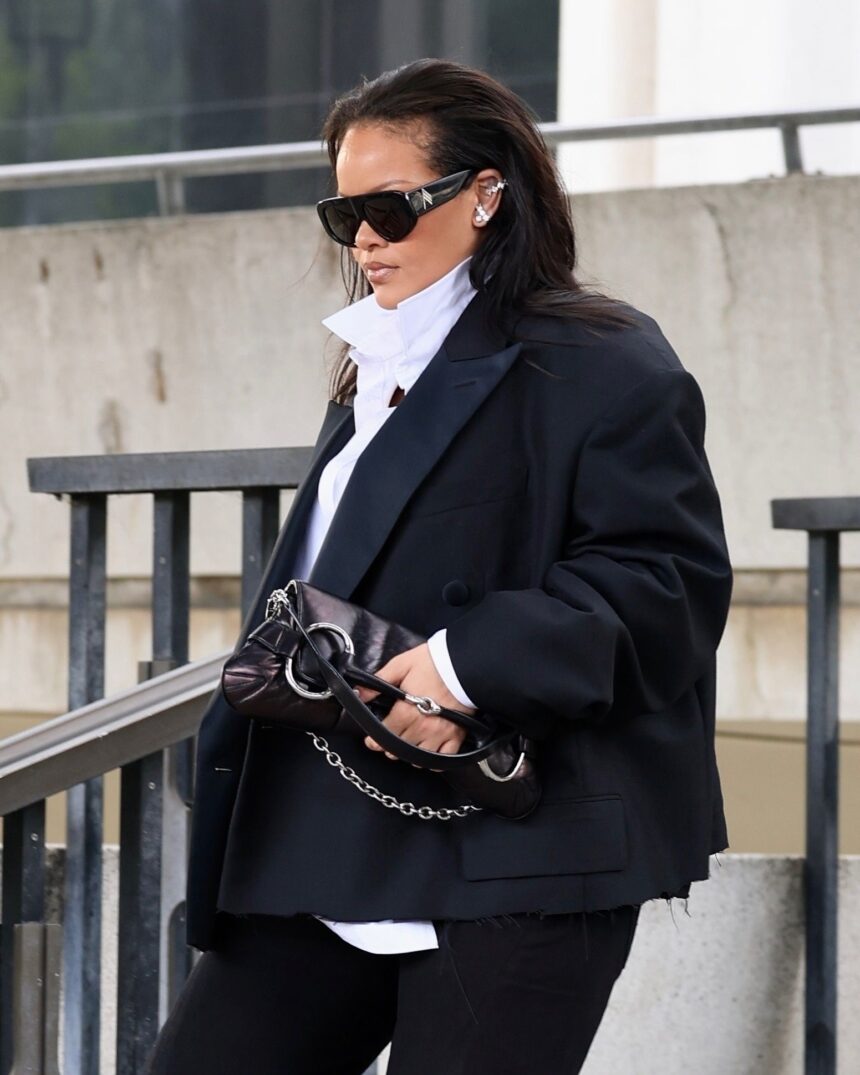 If anyone can be trusted with turning errands into runway moments, it’s Rihanna. Last month, when she headed to the Los Angeles County Department of Public Health Vital Records office to organize her daughter Rocki Irish’s birth records, she offered a bold take on bureaucratic chic: wearing a shredded hem and heavily shoulder padded suit, paired with a white button-up with an exaggerated popped collar. In lieu of a briefcase, she opted for an east-west Gucci horsebit clutch.
