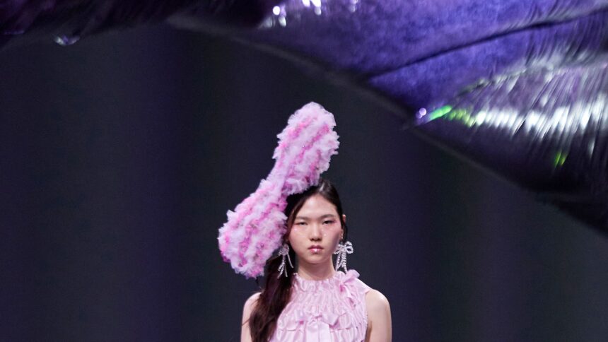 This rationale lent Fang coherent license to hop back and forth across history, plucking silhouettes from the 19th century, the mid-20th century, and the 21st century. She also flitted between contexts, presenting bridal-leaning looks and ballet tutus against daywear swathed in ski-sourced, sculpturally arranged down-filled panels. What connected them all was the aesthetic of ethereality she tried to conjure through the opaque lightness of her chiffon, tulle, and resin materials, and the cutesy, slightly saccharine sentiment telegraphed by the pastel color story and the plentiful use of embellishments shaped after lucky clover flowers, peach blossoms, and bows.