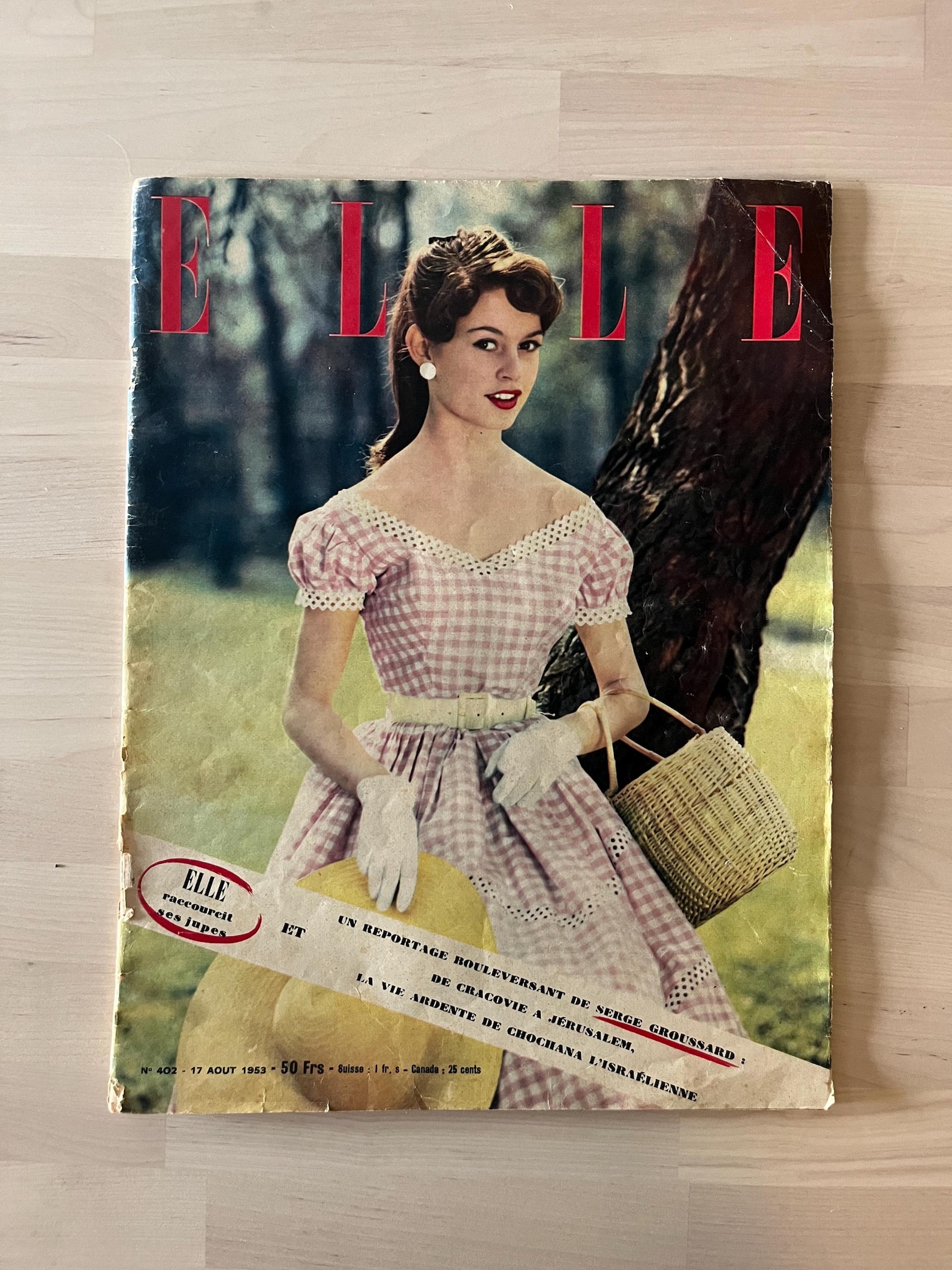 Bardot started life in the public eye as a ballet dancer, showing considerable promise. She modeled hats, and later dresses, for the magazines. And then, in August 1953 (through the machinations of her mother), she was the Elle girl, photographed for their cover wearing a full-skirted dress (by the ready-to-wear brand Virginie) in pink and white gingham, which the French called toile de Vichy. She had wrist-length white gloves and was carrying a large-brimmed straw hat and a basket purse of wicker. With her then brunette hair pulled back and her fresh-faced looks, which are just a little knowing, this cover was a sensation.