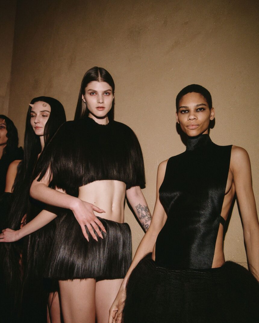 While the fur renaissance is busy reaching its final form on the New York runways, Showpony is opting for a less traditional textile to add a bit of funky texture. Specifically, hair, courtesy of over a decade of excess supplies piled up in the studio of avant-garde hairstylist Evanie Frausto and his newly minted brand. “I’ve always been the kind of person where I even hate throwing my food away, so I was like, ‘I’m gonna use this one day,’” he said. At his debut runway show, a new kind of hair-ography finally came to fruition.
