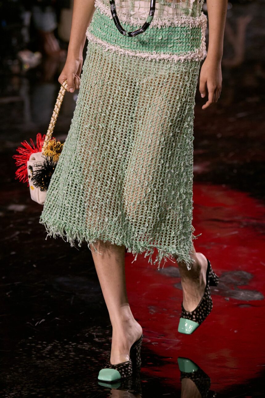 It was Chanel, though, that really riffed on the toothpaste tube, with mint-capped pumps and foamy-toned bags, the colors proliferating across openwork crochet skirts, macrame belts, bouclé dresses, and tweed blazers. Set among a color palette of reds, pinks, golds, and grays, mint felt fresh and fun. The green heels have been part of the wider frenzy for Matthieu Blazy’s first drop of Chanel in-stores. “I love that this fresh colorway is having a comeback all thanks to Blazy,” says writer Alice Betts. “On top of my wishlist is the Chanel small tote bag, it adds a perfect pop of colour that feels like a much needed playful antidote or pick me up.