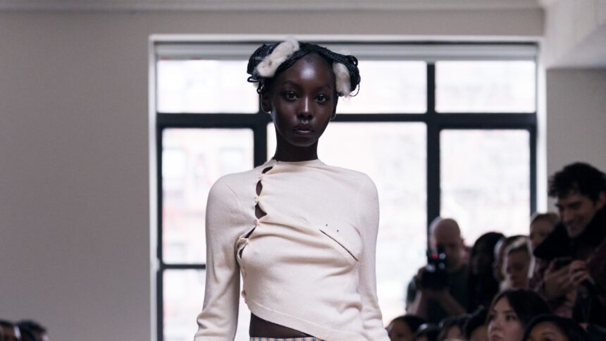Part of what made it a breakthrough was that the emphasis was on the clothes first, and communal experience a close second. Change was evident from the first exit, featuring a torqued sweater with a single hook and eye slit, possibly meant for breastfeeding. There were pants and much more tailoring, like a snug fencing-inspired jacket and another (look 2) with beautiful seaming front and back. It wouldn’t be a ZGAW show without milkmaid skirts and corsets, and Whalen admitted she is “still obsessed with a small little hip pad situation, but it’s all very soft and loving and still quite small and subtle.” (A woman’s waist to hip ratio is often associated with fertility.)